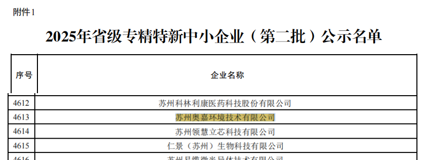 近日,江苏省工业和信息化厅正式公布2025年度江苏省专精特新中小企业名单,苏州奥嘉环境技术有限公司成功获此殊荣!