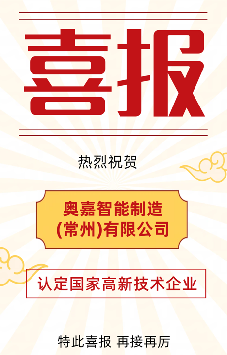 同时,全资子公司奥嘉智能制造科技(常州)有限公司通过国家高新技术企业认定!这项认定,这不仅是获得一项国家级资质认证,更标志着我司在技术创新、研发能力、产业竞争力等核心维度达到了国家认可的高标准,对企业发展有多重关键意义。